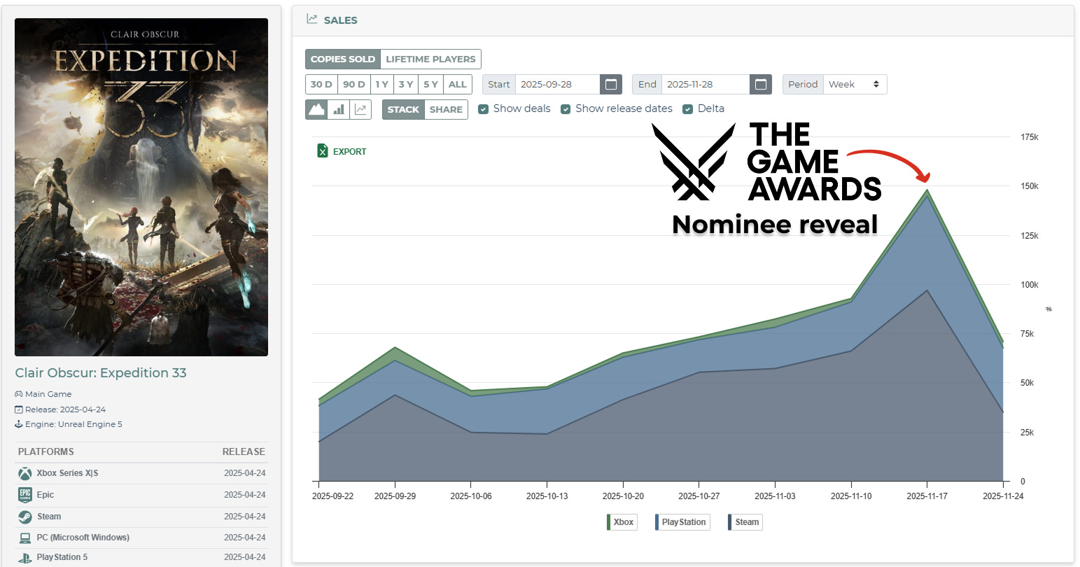 Следует также отметить, что, согласно официальным данным Sandfall Interactive и Kepler Interactive, по состоянию на 8 ноября 2025 года было продано более пяти миллионов копий Clair Obscur: Expedition 33.