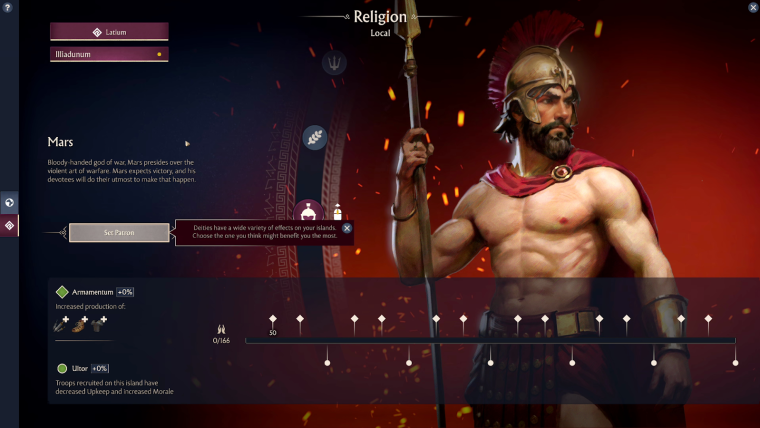 Религия также превращается в стратегический ресурс: города могут посвящать себя конкретным богам из пантеона, каждый из которых дает уникальные бонусы. Каждому острову, на который поселится игрок, разрешено выбирать одно божество для поклонения. Эти божества дают этому острову особые баффы и бонусы.