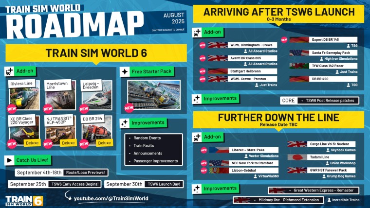 Среди ключевых нововведений TSW6 заявлены случайные события во время рейсов, возможность возникновения неисправностей поезда, а также система объявлений на платформах и в салонах.