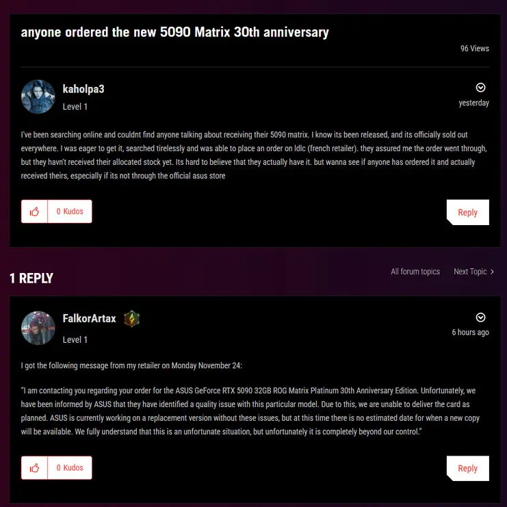 Теперь компания ASUS пояснила, что никакого отзыва не было и что возвращённые экземпляры были частью обычного процесса перераспределения в рамках канала продаж. По словам компании, первые партии продукции были перенаправлены другим региональным партнёрам, что потребовало перемещения части запасов через распределительные центры. Компания ASUS заявляет, что такая корректировка является обычной при согласовании запасов для флагманского продукта и не указывает на наличие каких-либо дефектов. Конструкция оборудования, прошивка и производственные параметры серии ROG Matrix остаются неизменными.