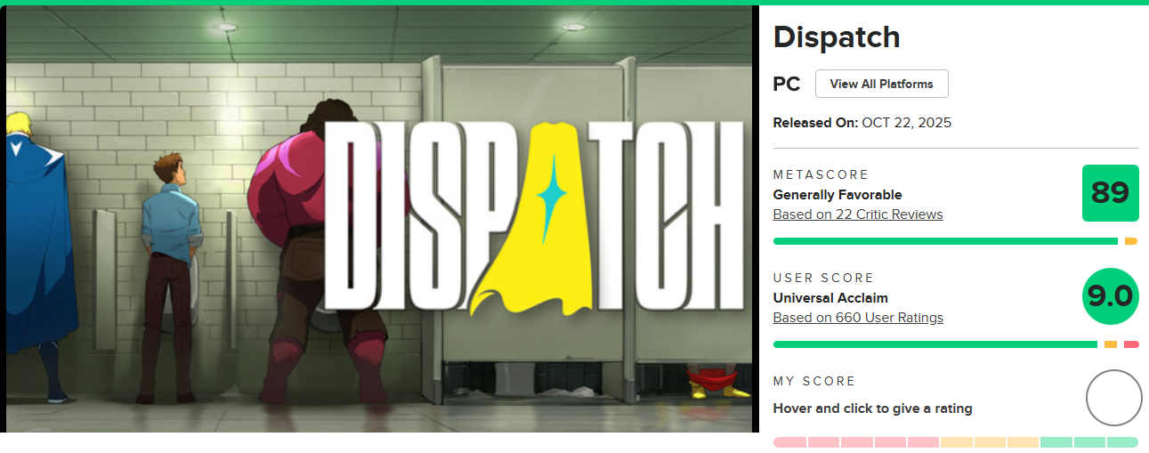Игра Dispatch, разработанная студией AdHoc Studio и выпущенная 22 октября 2025 года, завоевала признание критиков и стала одной из самых высокооцененных игр года. Согласно рецензиям, которые появились на агрегаторе Метакритик после выхода последних эпизодов 12 ноября, игра получила впечатляющие оценки от ведущих игровых изданий: