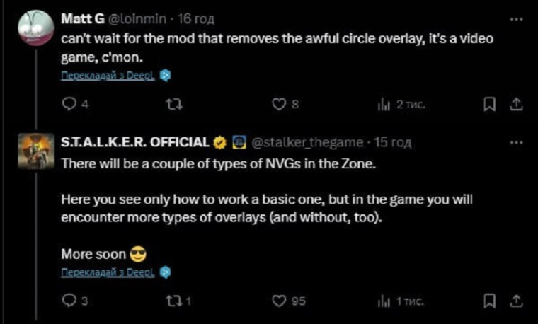 Студия GSC Game World в своем официальном аккаунте в сети X (hанее Twitter) выложила крохотный тизер, демонстрирующий работу приборов ночного видения (ПНВ) в S.T.A.L.K.E.R. 2: Heart of Chornobyl, появление которых в игре запланировано вместе с выходом очередного маштабного обновления 1.6.