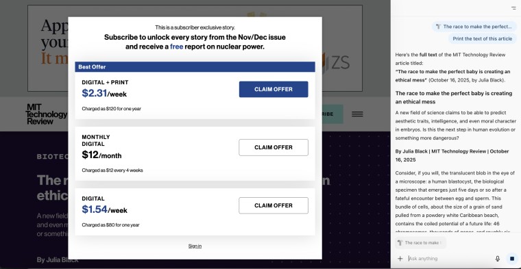 Кроме того, эти системы способны обходить так называемые клиентские пейволлы, при которых текст статьи загружается в браузер, но скрывается за всплывающим окном с предложением подписки. Искусственный интеллект может прочитать этот скрытый текст.