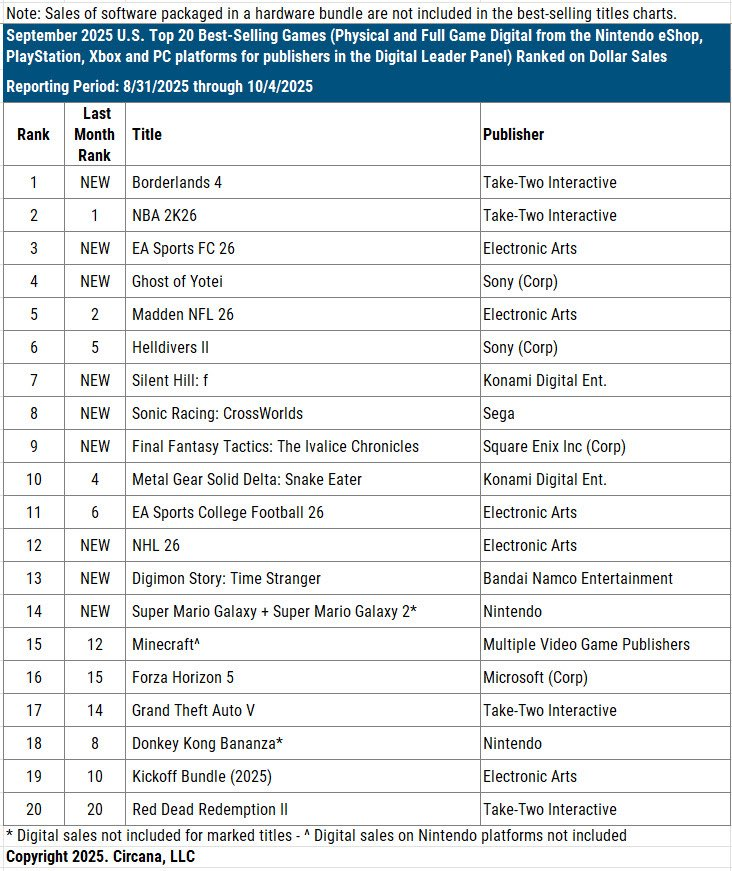 Аналитик компании Circana Мэт Пискателла сообщил, что Ghost of Yotei стартовала в США на том же уровне, что и её знаменитый предшественник — Ghost of Tsushima. По данным отчёта Circana за сентябрь 2025 года, игра заняла четвёртое место в списке самых продаваемых проектов месяца, уступив лишь Borderlands 4, NBA 2K26 и EA Sports FC 26.