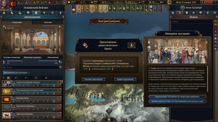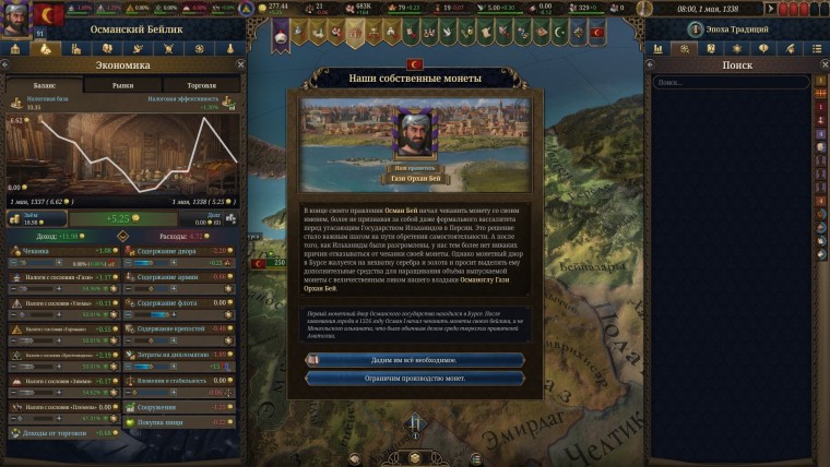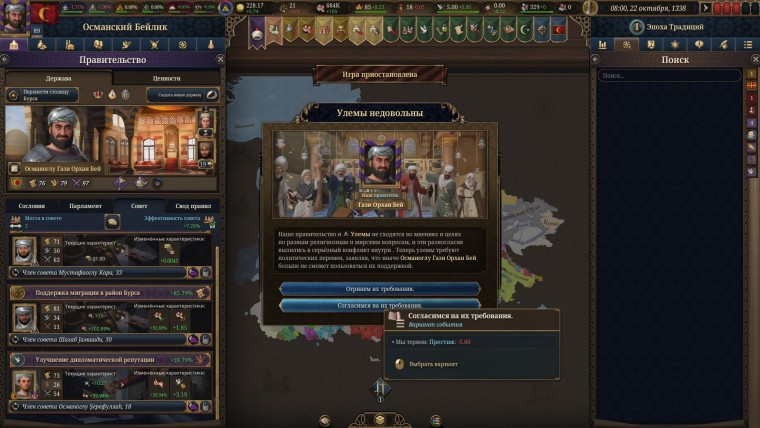 Или вам его навяжут. Да, в игре, в который вы должны быть единым и великим, далеко не все зависит от вас. Пример с реформами выше лишь малая часть того, что будет подкидывать вам игра и королевство. Любой ваш план или идея разлетится как зубы о бордюр, столкнувшись с цепочкой событий, запущенных даже не в вашем. а соседнем государстве. Или одно неверно принятое решение в самом начале партии, когда вы решили сделать общество более приверженным традиционализму, чтобы укрепить экономику через сельское хозяйство, выйдет вам боком через пару сотен игровых лет. когда вы будете в шаге от построения идеальной феодальной системы без влияния духовенства.