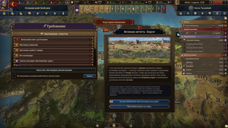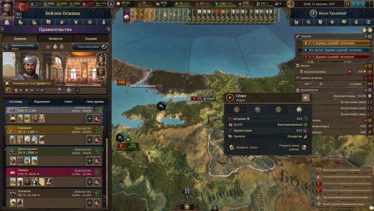 Самый простой способ держать все сословия в узде: грамотно выстраивать характер нации, который формируется религией, языком и культурой. В какой-то момент ты понимаешь, что у твоего народа появляется уникальная идентичность, и он живо реагирует на различные события, исходя из заложенных ценностей и чувства привязанности к стране. Не исключено, что это просто мой мозг так надо мной подшучивал в процессе игры, но за всеми этими “контурными картами” проявляется живой облик страны, что впечатляет.