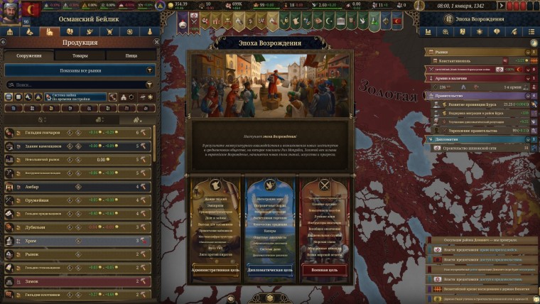 К слову об экономике. В пятой части этот аспект также подвергся серьезному ребалансу и углублению. Теперь у вас не будет какого-то абстрактного “производства” и простых торговых маршрутов. В игре представлены сотни различных товаров, и производство каждого разворачивается в рамках отдельных провинций. С одной стороны: это очень удобно, ведь вы решаете, где и какие производства будут находиться. В случае слишком агрессивных соседей, даже проигрывая войну, вы можете оставаться при солидных ресурсах и до последнего оставлять возможность для победы или завершения конфликта на приемлемых условиях. А с другой: это еще один аспект, за которым нужно постоянно следить и продумывать на сто шагов вперед.