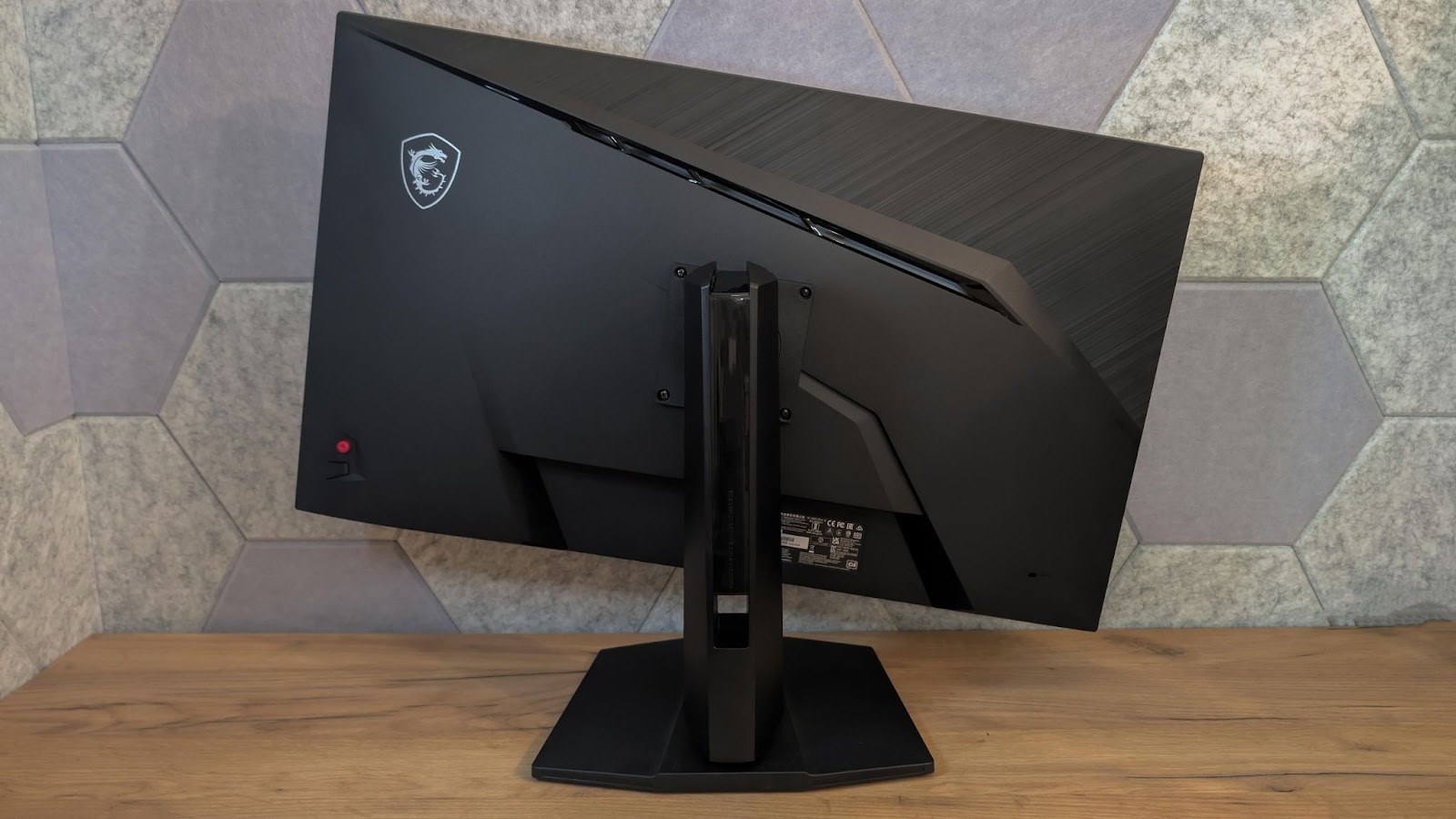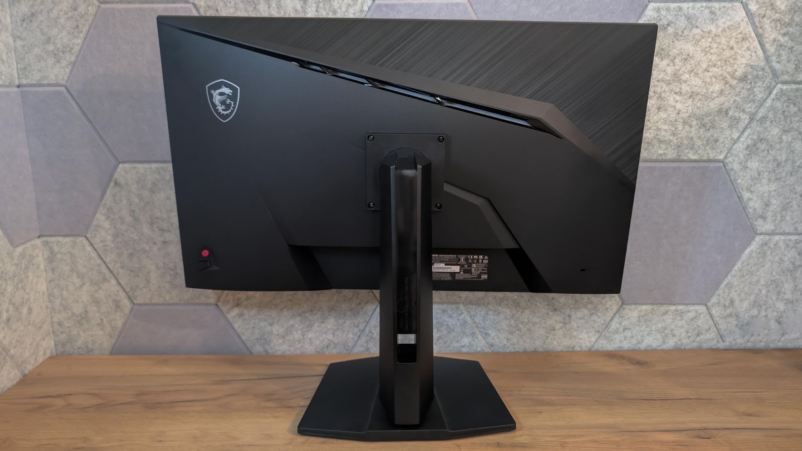 Задняя крышка самого MAG 322URDF E16 оформлена достаточно дерзко. Резкие линии и скрытая внутри ARGB-подсветка сразу выдают геймерский характер, но без ощущения перегруженности. Это не кричащий дизайн, а скорее аккуратный намёк на игровую направленность. Выглядит стильно и уместно, особенно если монитор стоит на виду. И да, если у вас светлая стена, то подсветка вполне заметна и придает немного атмосферности игровому месту.
