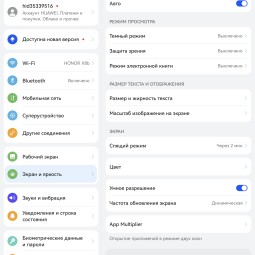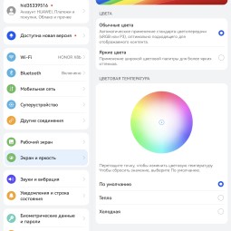 В настройках, по аналогии со смартфоном, можно переключаться между светлой/тёмной темами, регулировать яркость (по умолчанию стоит автоматическая), размер и жирность шрифта, а также время перехода устройства в спящий режим. Для частоты обновления экрана предусмотрены три настройки: высокая (144 Гц), стандартная (до 60 Гц) и динамическая. Также изменяются цветовой режим и температура. Имеются две преднастройки «Обычные цвета» и «Яркие цвета». Самостоятельно можно настроить температуру цветов, перемещая курсор в цветовом спектре.