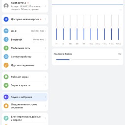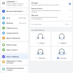 В настройках можно установить один из четырех звуковых профилей: «Авто», «3D-аудио», «Реалистичность» и «Обычный». По умолчанию выставлен первый профиль. Предустановка «3D-аудио» интересна тем, что открывает доступ ещё к четырём аудиоэффектам: близкое звучание, переднее, объёмное, максимум (сбалансированное). Выбрав профиль «Обычный», можно самостоятельно настроить десятиполосный эквалайзер, а также дополнительно усилить басы.