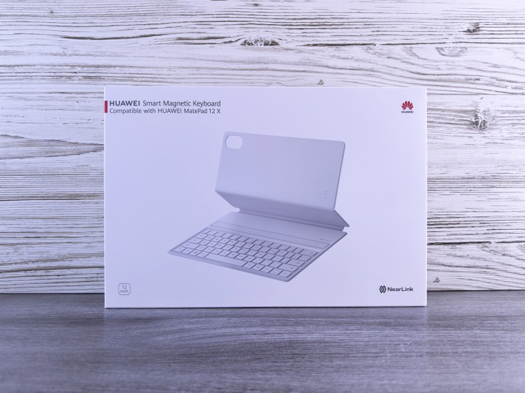 Магнитная клавиатура упакована в отдельную коробку, также белого цвета. Надпись в верхнем левом углу говорит о совместимости клавиатуры с планшетом HUAWEI MatePad 12 X и, соответственно, его модификациями (в нашем случае PaperMatte). В правом верхнем углу находится логотип «HUAWEI» в фирменной красно-черной расцветке. Посередине изображена развернутая клавиатура с чехлом. Внизу мелким шрифтом имеется надпись «NearLink» — это технология беспроводной передачи данных, разработанная компанией HUAWEI, с помощью которой, собственно, и подключается клавиатура к планшету.