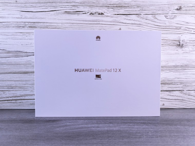 HUAWEI MatePad 12 X поставляют в белой прямоугольной коробке из мелованного картона. В минималистичный дизайн упаковки органично вписываются золотистые логотип «HUAWEI» в верхней части, название модели «HUAWEI MatePad 12 X» и обозначение модификации «PaperMatte».