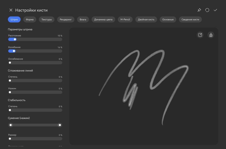 В ходе тестирования стилус HUAWEI M-Pencil Pro показал себя превосходно, в сочетании с матовым экраном создавалась ощущение, словно в руках держишь карандаш и листок бумаги. Линия появляется ровно в том месте, где стилус соприкасается с дисплеем, ни о каком смещении или задержке и речи не идёт. Для удобства предусмотрена быстрая панель доступа, позволяющая редактировать слои, менять цвет кисти, поворачивать картинку и зеркально отображать ее. Масштаб изображения также можно менять, что помогает удобно работать с мелкими деталями.