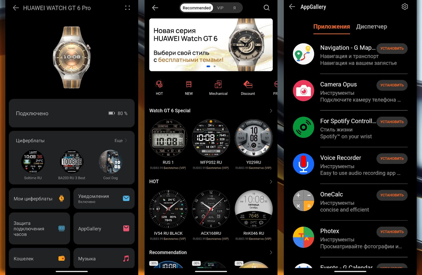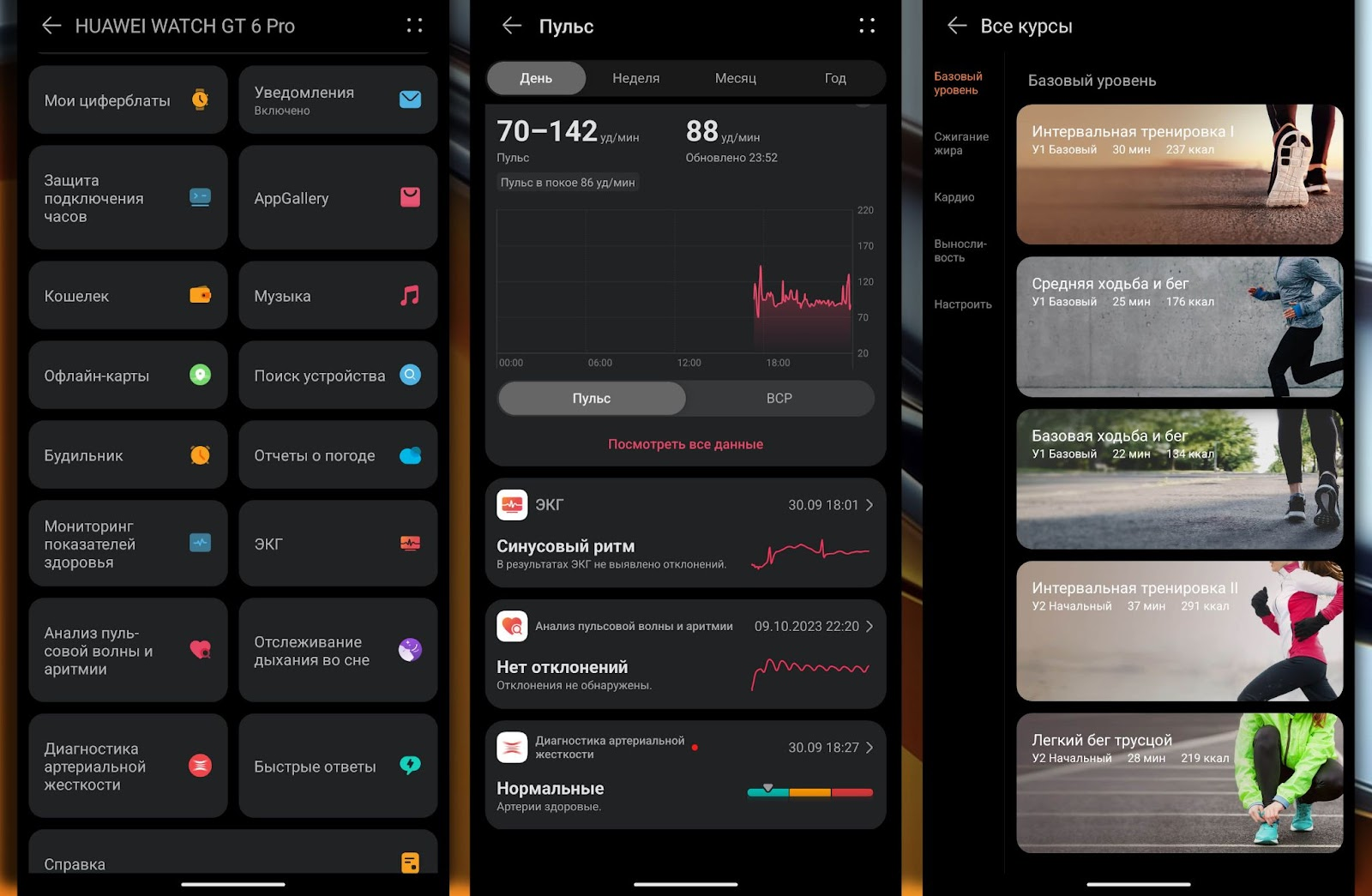 Управление и анализ данных сосредоточены в приложении HUAWEI Health. Оно собрано аккуратно и интуитивно: графики сна, активности, тренировок подаются наглядно и без перегруза лишней информацией. Хотя некоторые опции кажутся рассчитанными скорее на энтузиастов, чем на массового пользователя, в целом приложение и использование всех “фишек” Watch GT 6 Pro оставляет приятное впечатление.