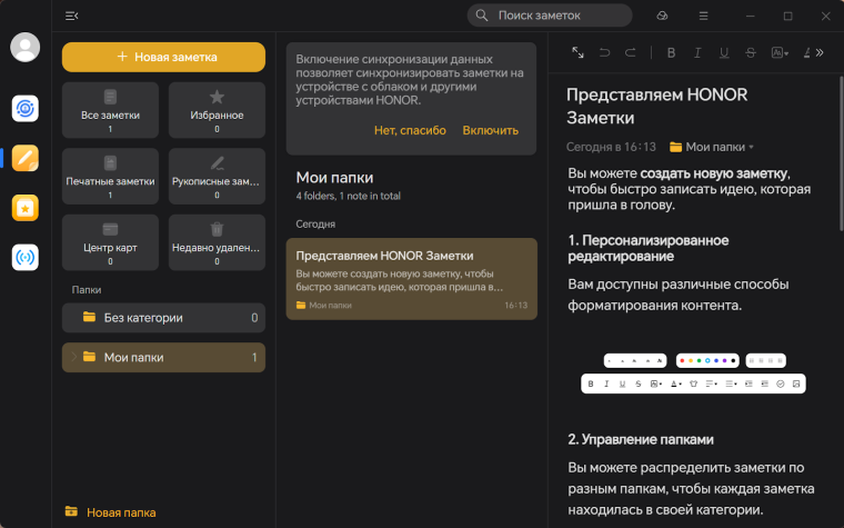 Помимо PC Manager, из коробок предустановлен еще HONOR WorkStation. Это приложение создано, прежде всего, для синхронизации файлов, записей и уведомлений на нескольких устройствах, объединенных под одним аккаунтом. Можно делать заметки на телефоне, и они сразу появятся на вашем ноутбуке, например. Или в один клик синхронизировать рабочие файлы на “большом” компьютере и вашем “походном” девайсе.