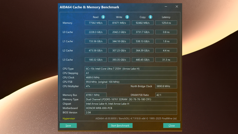 Тест чтения памяти и кэша ноутбук прошел на ура. Результаты сопоставимы с обычной DDR 5 в ноутбуках или десктопах (но, с меньшей эффективной частотой).