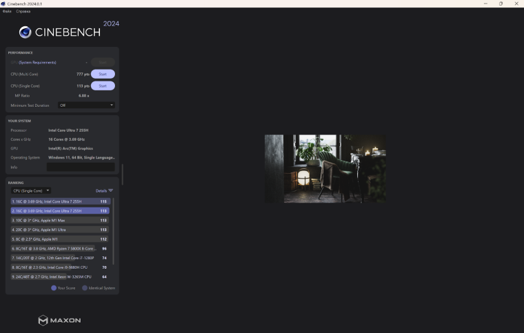 В синтетическом тесте Cinebench 2024 заметно, что процессор немного отстает в многопоточном режиме. В однопоточном тесте результаты отличные и близки к максимум для Core Ultra 7 255h.