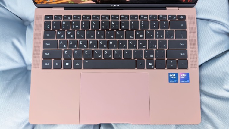 Основной материал корпуса: магниевый сплав (аэрокосмического класса, как утверждает производитель), с приятной текстурой, немного, напоминающей софт тач. Тактильные ощущения от HONOR MagicBook Art 14 2025 очень необычные — устройство просто приятно держать в руках. И это не приедается со временем.