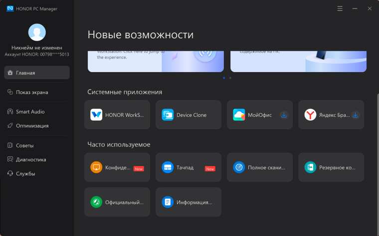 На ноутбуке установлен фирменный центр управления HONOR PC Manager, функции которого не ограничиваются настройкой схемы питания и выводом общей информации.