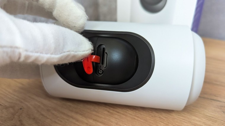 Можно включать вручную или голосом: например, сказать “Алиса, я вернулся” (смотря какой сценарий настроить в приложении), и она уйдёт в спящий режим. Для семей с паранойей (и геймерами, которые не хотят, чтобы кто-то видел, как они ночами играют в романтические визуальные новеллы) — это топовая функция. Кстати, если наклонить объектив вручную, то можно увидеть яркую накладку, за которой скрываются слот для карты памяти MicroSD и кнопка для сброса настроек.