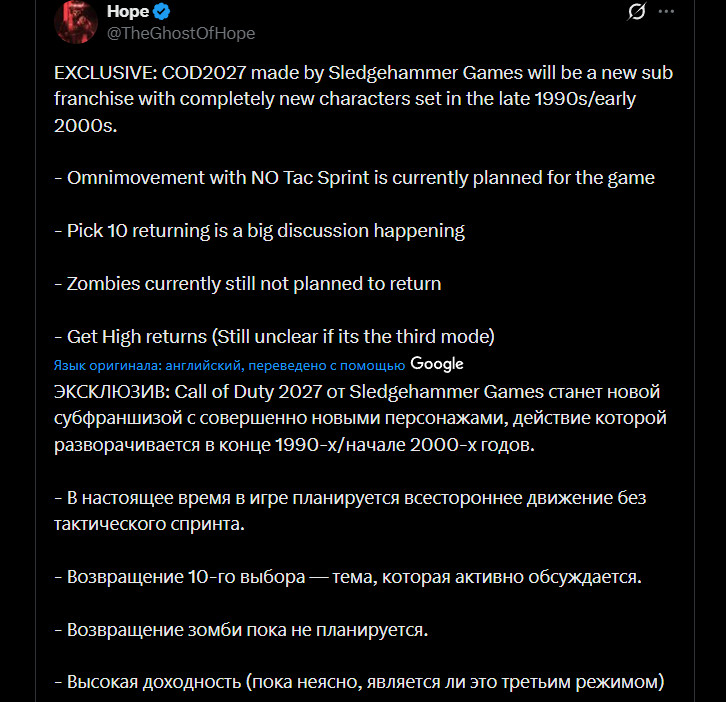 GhostOfHope также утверждает, что в новой части будут внесены существенные изменения в игровой процесс: в ней будет вседвижение, но без тактического спринта. Однако, пожалуй, самое большое изменение, о котором заявил GhostOfHope, заключается в том, что в игре 2026 года может вообще не быть режима «Зомби».