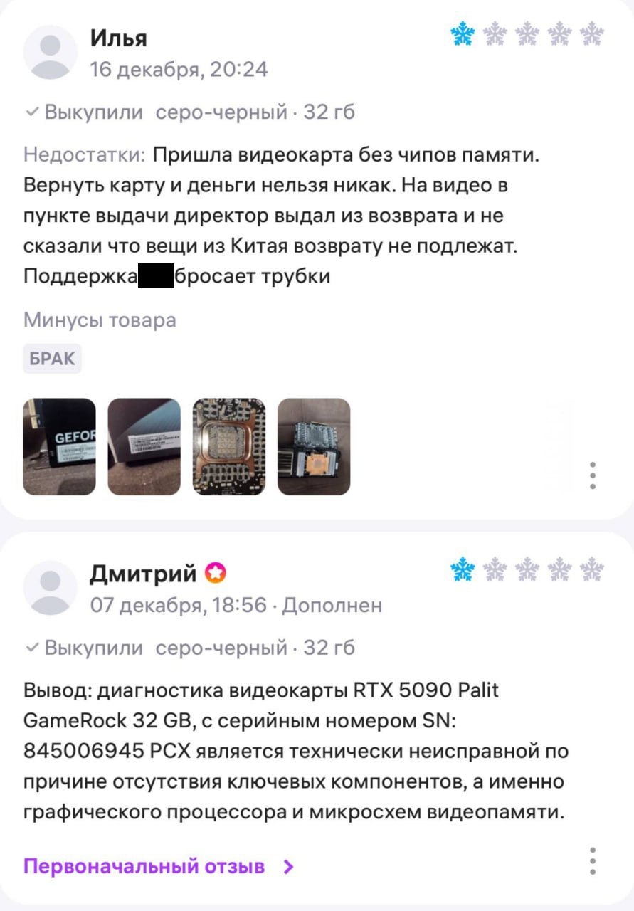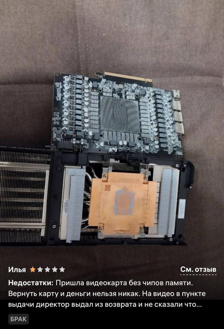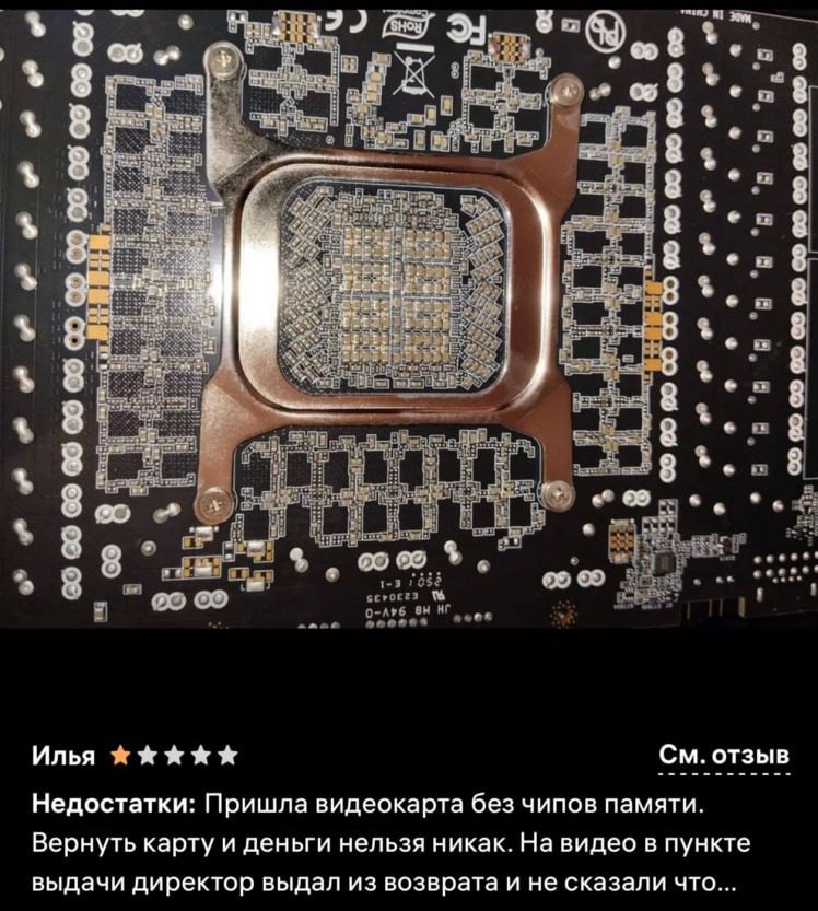 На популярных отечественных онлайн-площадках начали появляться отзывы от пользователей, столкнувшихся с серьезными проблемами при покупке графических ускорителей. Судя по опубликованным фотографиям и комментариям, клиенты получают видеокарты, которые визуально выглядят целыми, но при детальном осмотре оказываются лишены ключевых электронных компонентов.