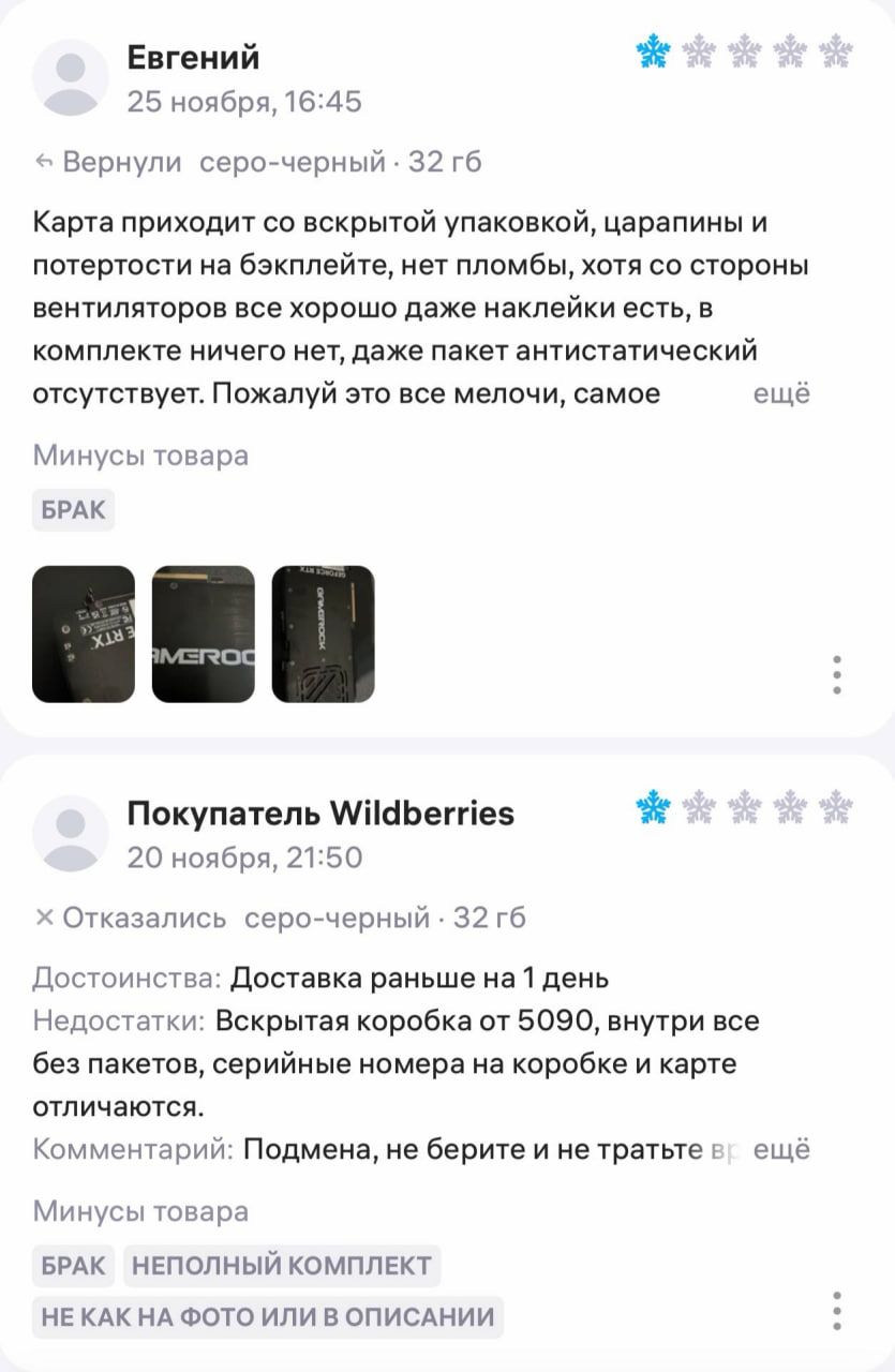 Помимо пустых плат, пользователи жалуются на состояние упаковки и комплектацию. В сообщениях упоминаются вскрытые коробки, отсутствие заводских пломб и защитных антистатических пакетов. Также зафиксированы случаи несоответствия серийных номеров на устройстве и на коробке, что может свидетельствовать о подмене товара на этапе логистики или возврата.