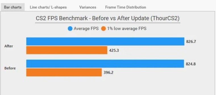 Датамайнер Thour проанализировал FPS в Counter-Strike 2 до и после выхода обновления. Согласно его исследованию, средняя частота кадров практически не изменилась. Но во время самых сильных нагрузок FPS вырос на 7%.