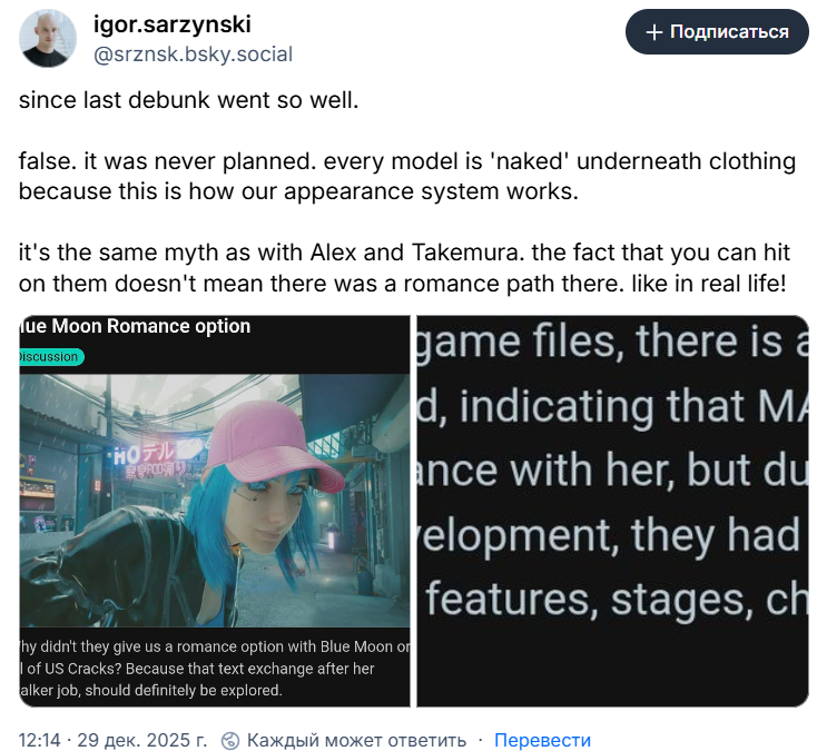Разработчики Cyberpunk 2077 обсуждали возможность добавить в игру роман с Блю Мун после релиза