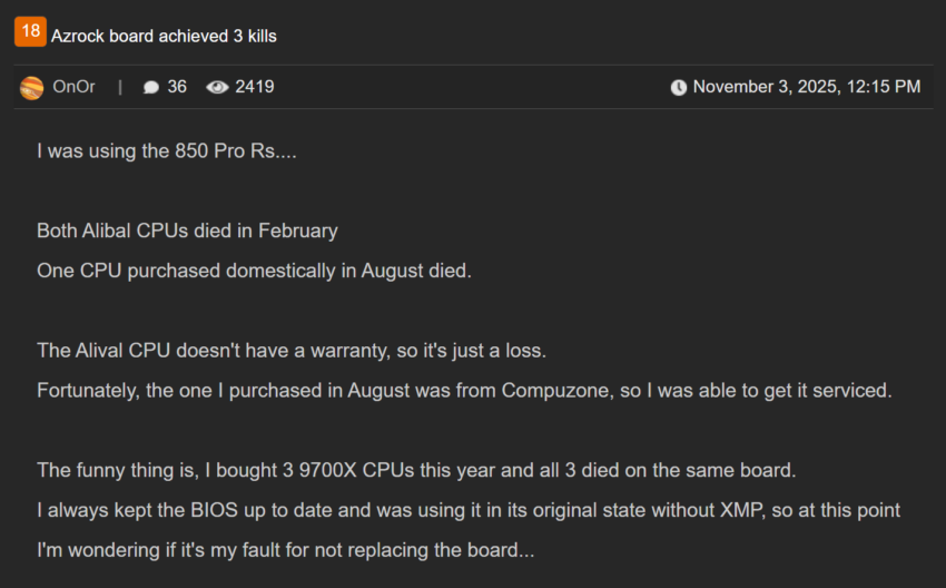 Пользователь OnOr на южнокорейском форуме QuasarZone рассказал, что три процессора Ryzen 7 9700X вышли из строя на материнской плате ASRock B850 Pro RS. Первые два чипа были куплены на AliExpress и вышли из строя подряд. Владелец отправил материнскую плату в сервис, но ритейлер Compuzone признал её исправной. Затем пользователь купил третий процессор у официального дистрибьютора, но и он не работал. Пользователь отправил неисправный процессор и материнскую плату в Compuzone, ожидая дальнейших инструкций.