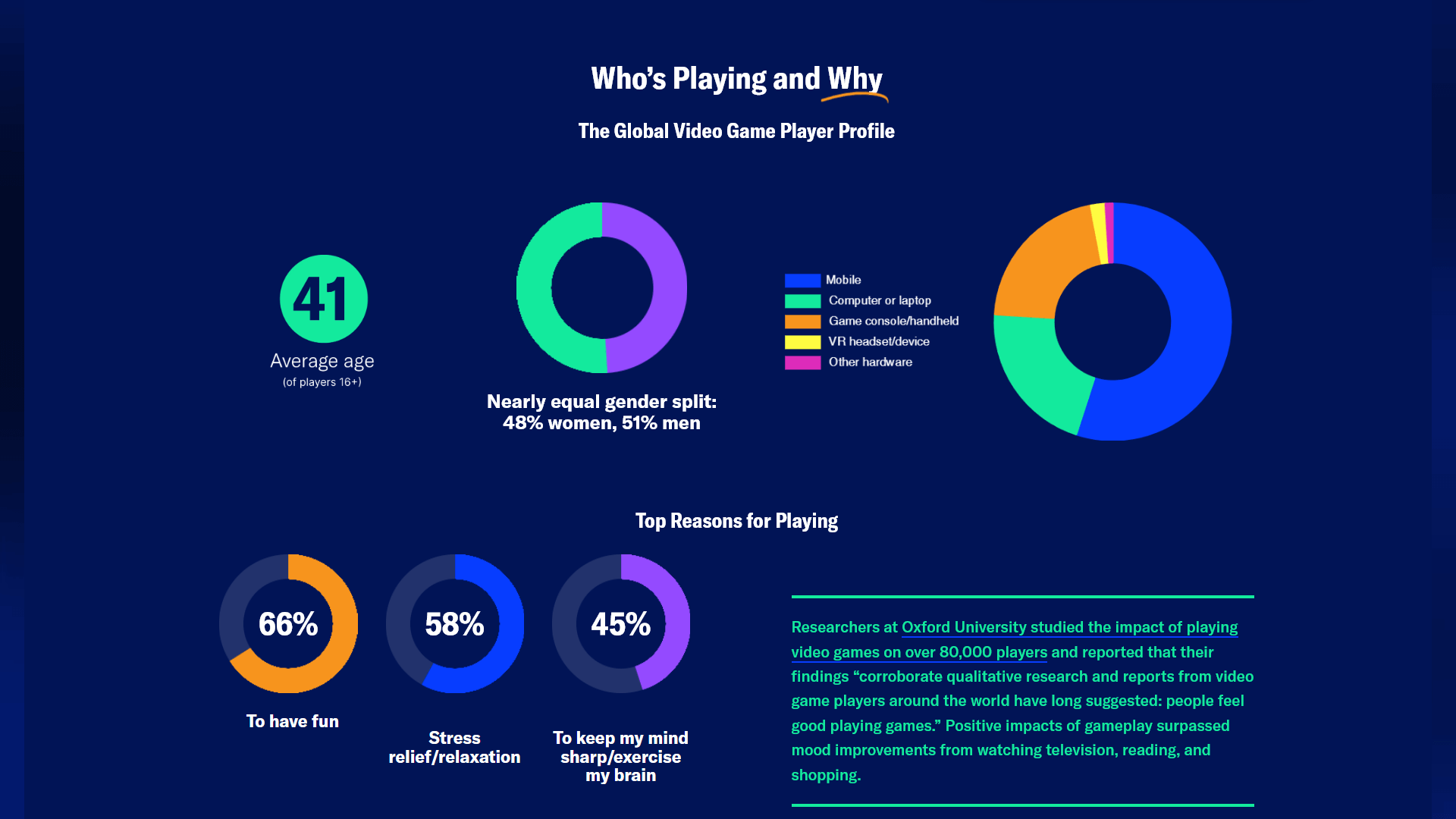 В отчете также отмечается практически равное распределение: 51% игроков — женщины и 48% — мужчины, что подтверждает, что игры вышли за рамки исключительно мужского занятия. Самым популярным игровым устройством в мире является смартфон, которым пользуются 55% респондентов, за ним следуют ПК и консоли с 21% каждая, что отражает сохраняющуюся важность мобильных игр на рынке.