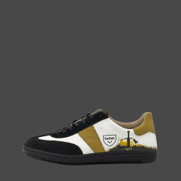 Обувь выполнена в стильной черно-бело-золотой гамме, отсылающей к средневековой эстетике игры. На кроссовках можно заметить множество деталей, знакомых фанатам: герб с тремя звездами, силуэт меча на фоне даты «1403» (год начала событий саги) и даже изображение самого Индржиха на боковой части.