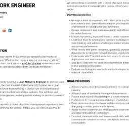 В тексте вакансии говорится, что CD Projekt Red ищет Lead Network Engineer, то есть главного сетевого инженера. Обязанности не оставляют сомнений – должность включает в себя проектирование и внедрение сетевой архитектуры и онлайн-систем, а также руководство командой, ответственной за их обслуживание и оптимизацию.