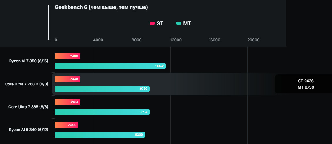 Итоговые значения зависят от конкретного теста, но в целом Panther Lake находится близко к среднему уровню 268V.