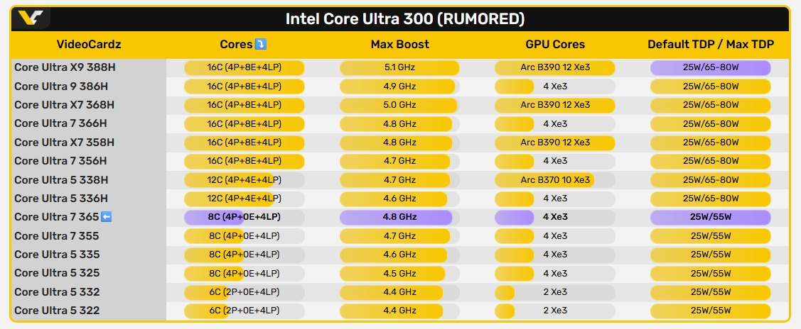 По данным утечек, TDP Core Ultra 7 365 составляет диапазон примерно 22–55 Вт, тогда как Core Ultra 7 268V укладывается в диапазон 17–37 Вт.