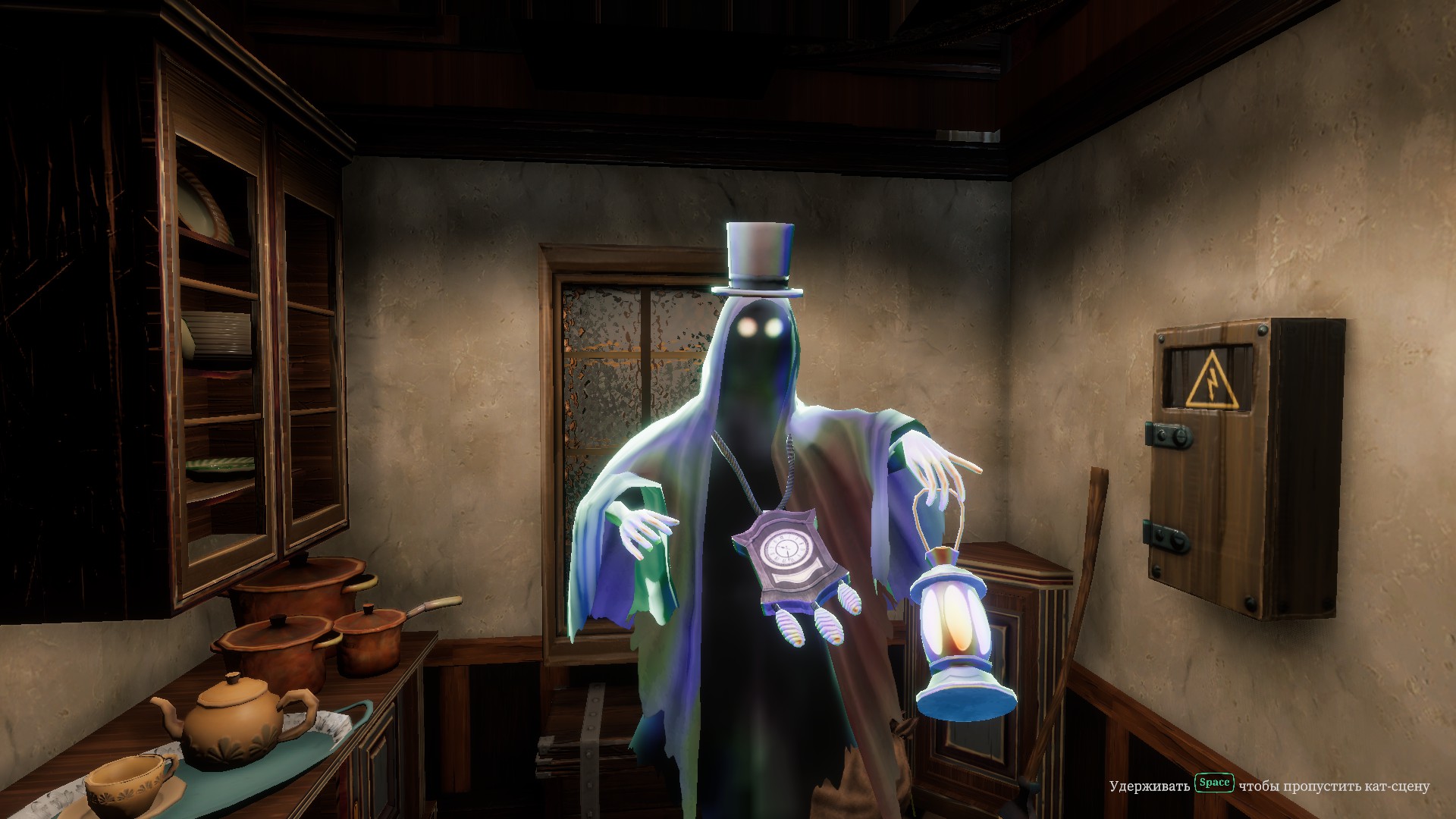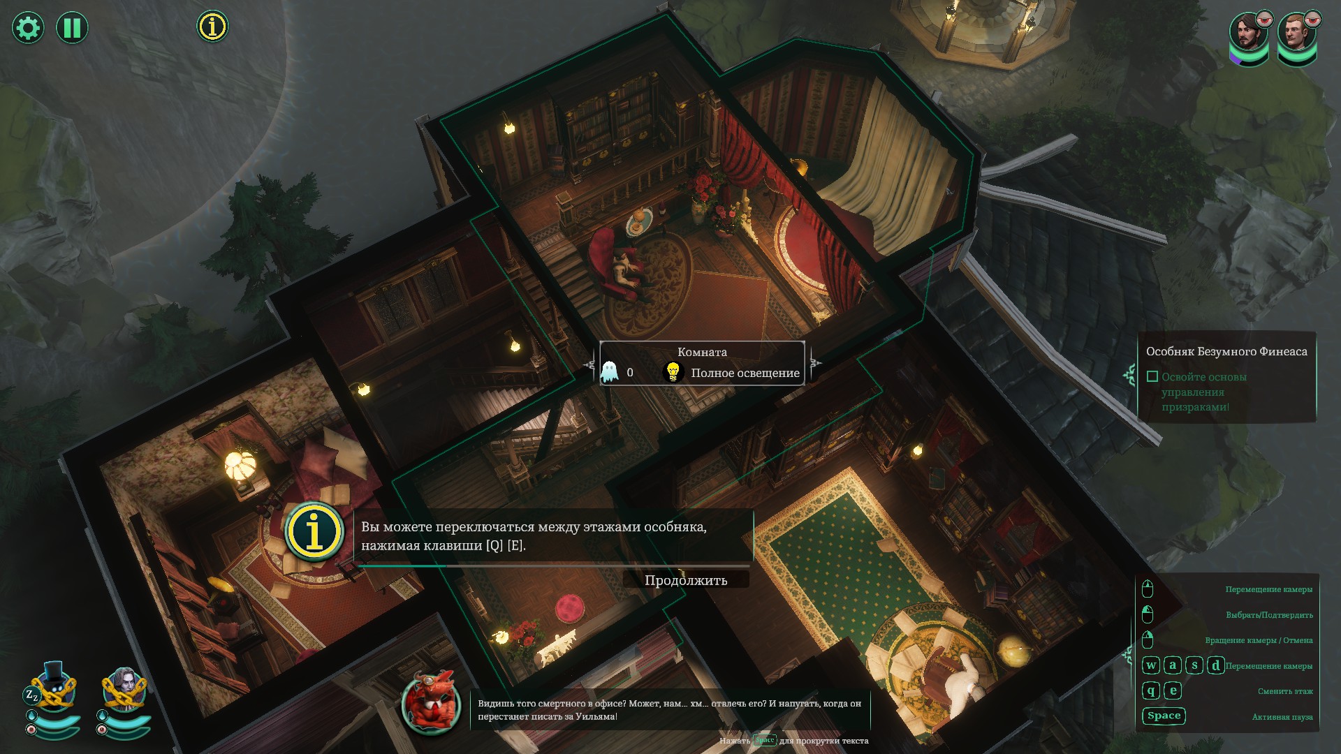 Первая миссия знакомит игроков с базовыми механиками и обучает простейшим навыкам управления, а вот вторая миссия уже интереснее: нужно освободить полтергейста Финеаса Безумного, застрявшего в камине. Действие разворачивается в особняке Финеаса, но, к сожалению, он уже мёртв. Это значит, что в доме полно людей, а моя задача как Хранителя призраков — помочь духам вернуть контроль над их бывшим пристанищем.