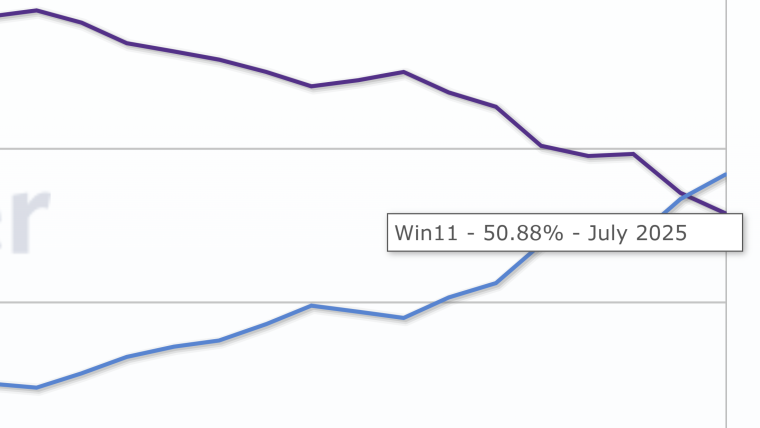 Windows 11 наконец-то достигла исторического рубежа, обойдя свою предшественницу по числу пользователей во всем мире. Согласно данным за июль 2025 г., опубликованным Statcounter, последняя операционная система Microsoft теперь занимает 50,88% рынка по сравнению с 46,2% Windows 10. Это первый раз, когда Windows 11 вышла в лидеры с момента ее запуска.