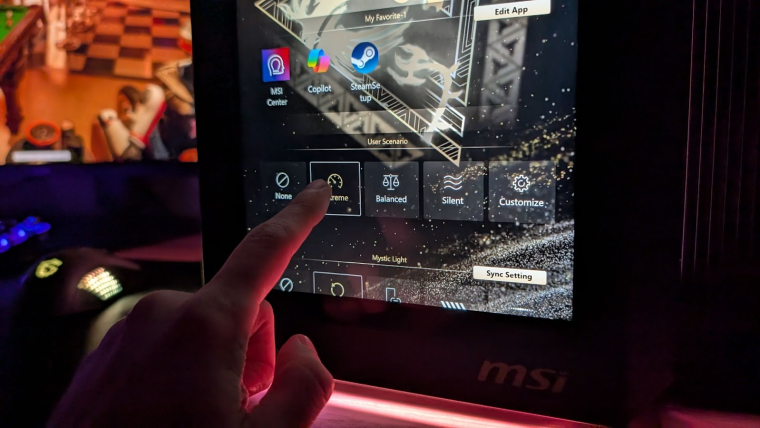 Заметную часть лицевой панели MEG Vision X AI занимает сенсорный экран диагональю 13 дюймов с разрешением 1080х1920. Это не просто сервисный экранчик, а полноценный монитор, который вполне можно применять по прямому назначению: вывести на него чат трансляции или смотреть вертикальные видео, пока очередная ААА-игра компилирует шейдеры перед запуском. Но по-умолчанию на нем запускается фирменное ПО MSI, дающее доступ к быстрым настройкам вашей системы.