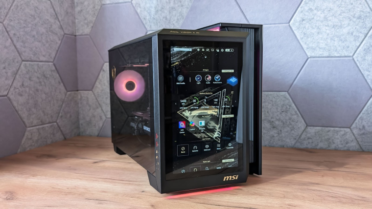 И вот мы добрались до главной звезды этого материала — MEG Vision X AI. Возможно, вы даже прокрутили статью сразу к этому фрагменту. А зря: не узнаете, что монитор умеет менять свою диагональ. Но не можем вас винить. Этот компьютер выглядит слишком необычно, чтобы не хотеть поскорее узнать, что он из себя представляет и зачем ему 13-ти дюймовый сенсорный экран.