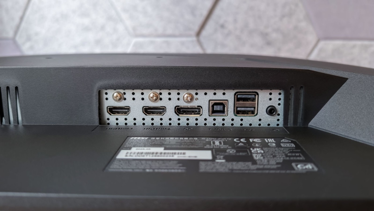 По разъемам тут весьма неплохой набор: DisplayPort 1.4a, 2хHDMI 2.1, 2хUSB-А 2.0, USB-B 2.0 и 3.5мм выход для гарнитуры. Немного смущает отсутствие USB-C. Понятно, что у монитора выраженная игровая направленность, но в 2025 году наличие порта явно не было бы лишним. Даже если не для подключения какого-то ультрабука в качестве источника видеосигнала, хотя бы для быстрой зарядки смартфона.